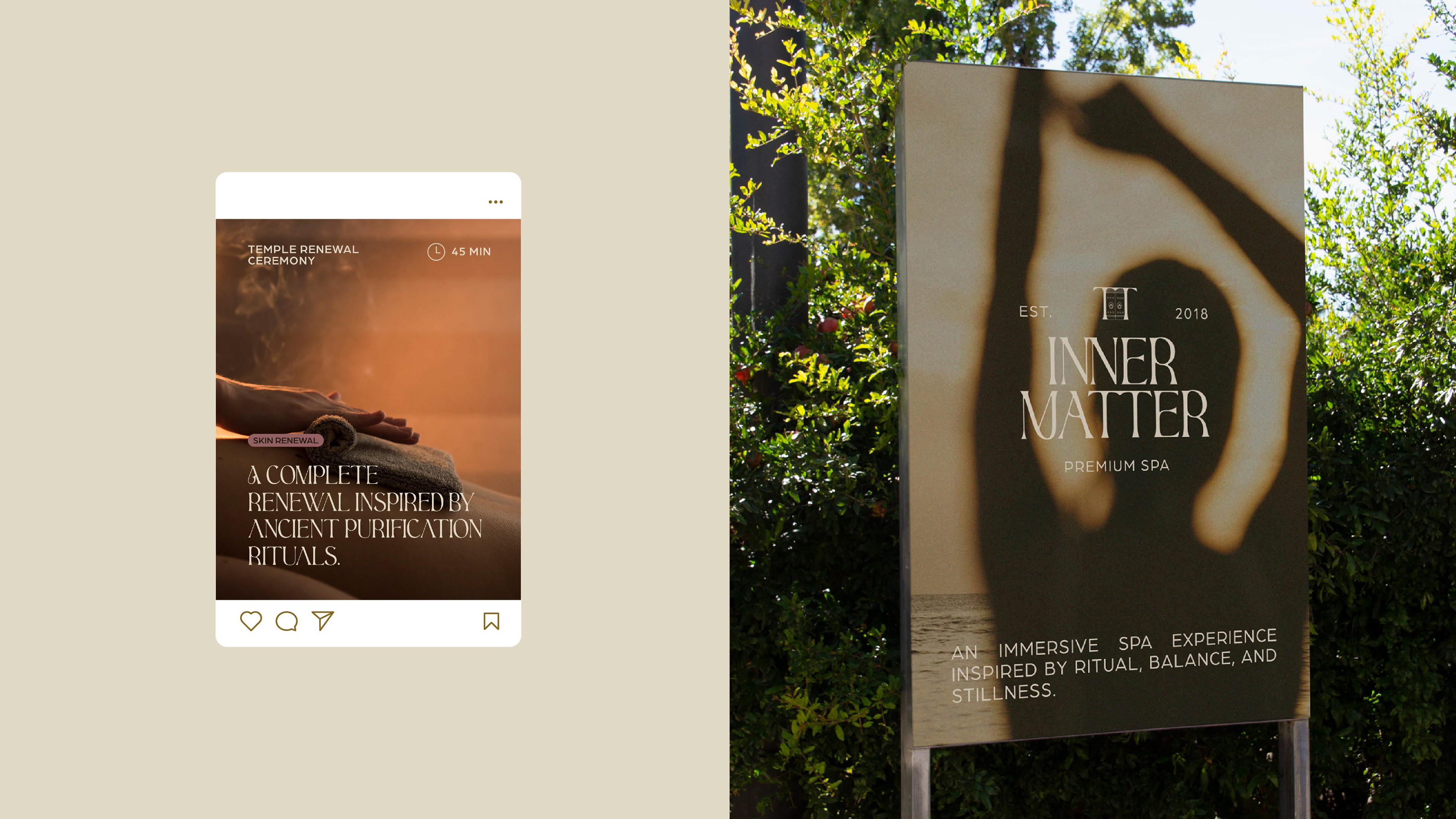 Inner Matter is a branding concept for a premium spa inspired by the idea of ritual, calm, and intentional self-care. The visual identity was designed to evoke stillness, depth, and a refined sensory experience — positioning the brand within the high-end wellness space.